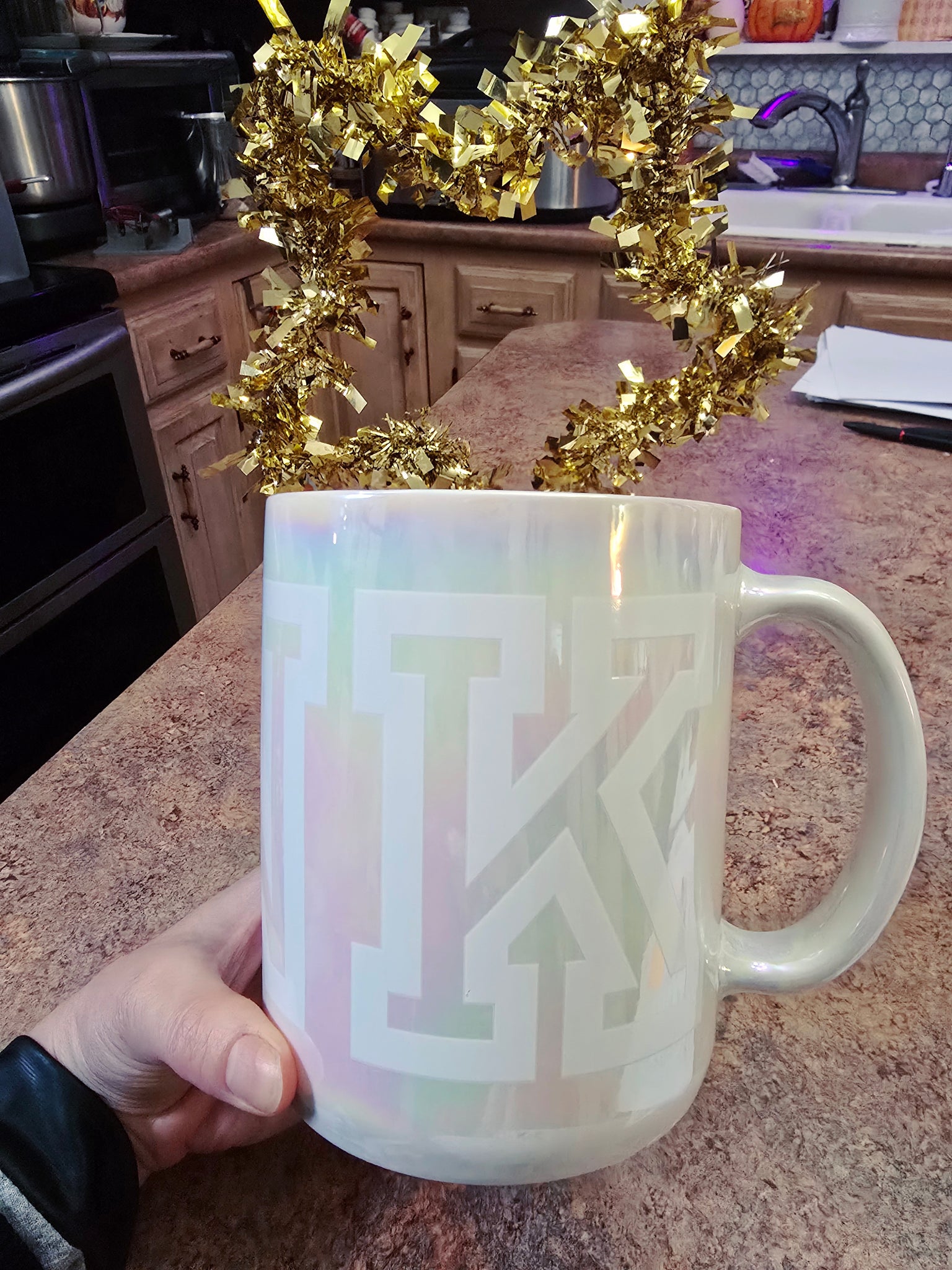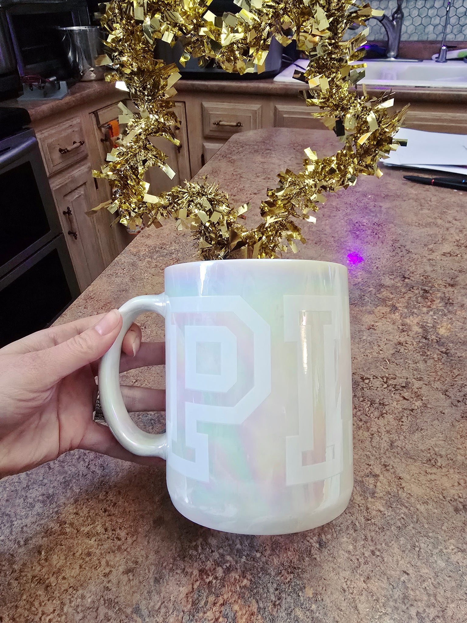 Iridescent ceramic hot/cold mug will hold 30 FL OZ! ***Display item in EUC.